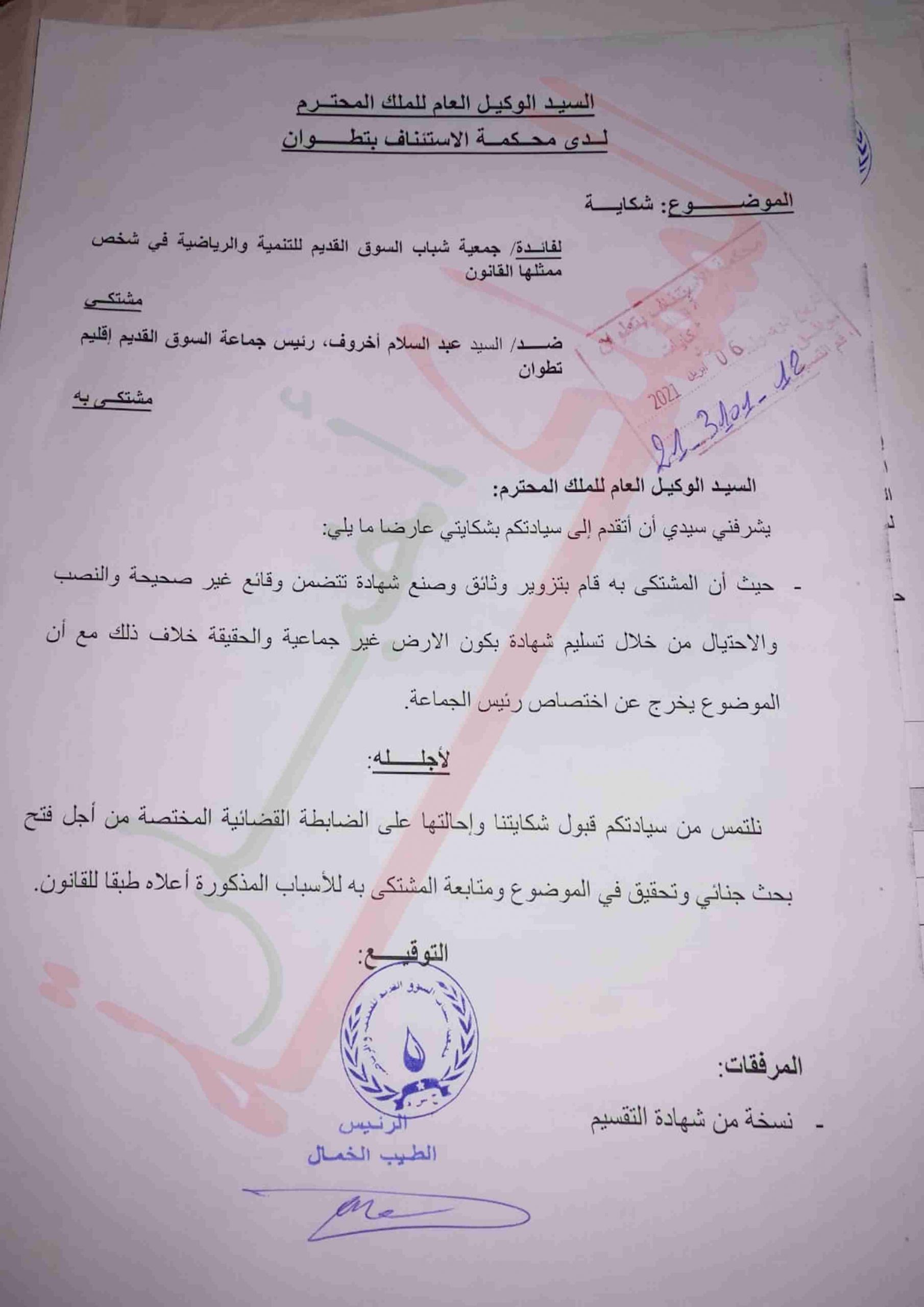 تقدمت جمعية شباب سوق القديم للتنمية والرياضة بشكاية إلى السيد الوكيل العام للملك بتطوان بتاريخ 16 أبريل 2021 ضد رئيس جماعة سوق القديم التابعة لإقليم تطوان المدعو (ع.أ) تتهم فيها بالتزوير والنصب والإحتيال و صنع وثيقة تتضمن وقائع غير صحيحة.