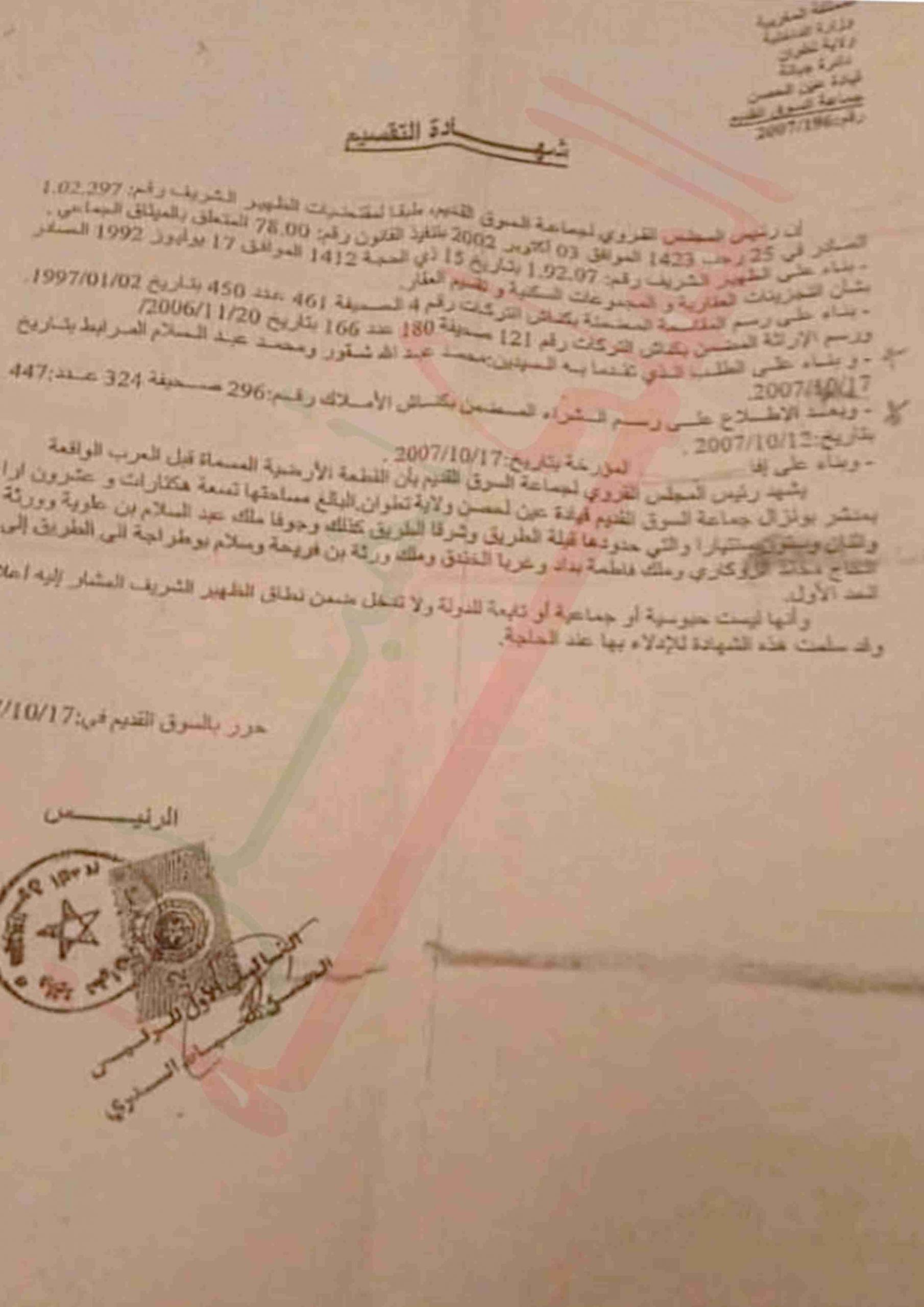 وإعتمدت جمعية شباب سوق القديم للتنمية والرياضة في شكايتها على نسخة من شهادة التقسيم التي تم تسليمها لشخصين من طرف رئيس الجماعة أعلاه بناء على طلب تقدما به بتاريخ 17/10/2017 وهو نفس اليوم الذي تم فيه تسليم شهادة التقسيم والغريب في الأمر أن رسم الشراء المضمن بكناش الأملاك كان بتاريخ 12/10/2017 أي بعد مرور خمسة أيام من وضع طلب الحصول على شهادة التقسيم مما يطرح أكثر من علامة إستفهام حول سرعة الإجراءات التي عرفها هذا الملف.