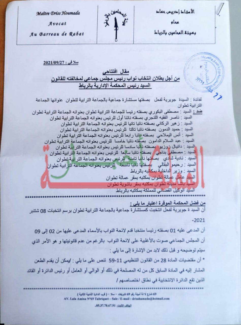 و دلك في دعوة قضائية رفعتها المستشارة الجماعية ضد رئيس المجلس الجماعي وعامل الإقليم، أمام رئيس المحكمة الإدارية بمدينة الرباط
