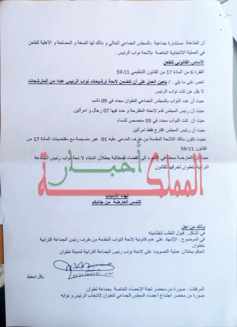 وطالبت لفحل التي فازت في الانتخابات الجماعية لـ8 شتنبر الجاري كوكيلة للائحة النسائية عن الحزب الإشتراكي الموحد بالحكم ببطلان مسطرة انتخاب نواب الرئيس، التي جرت بتاريخ 18شتنبر بمقر جماعة تطوان ، إستنادا للمادة 17 من القانون التنظيمي 113.14 مع ترتيب الٱثار القانونية على ذلك.
