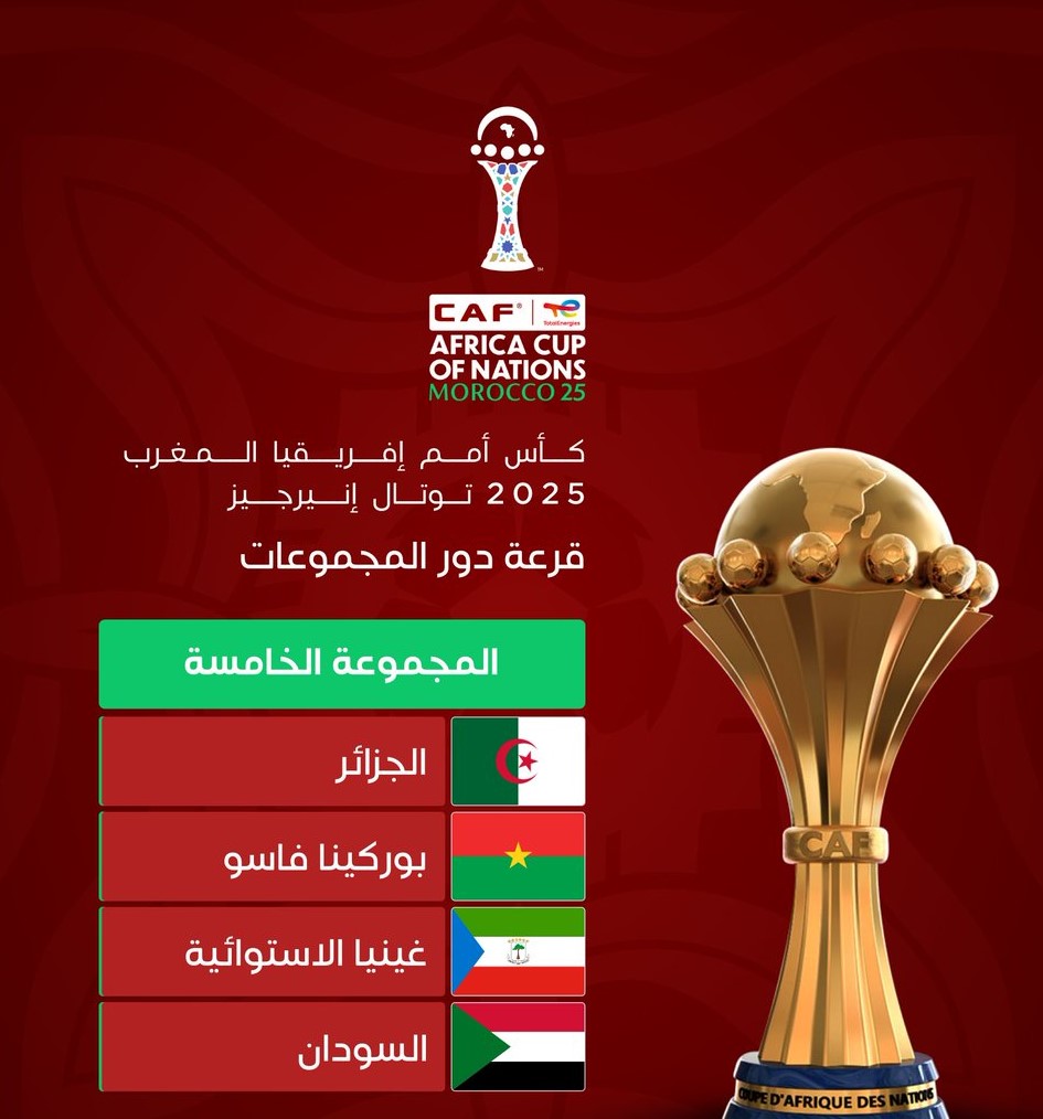 تتجه الأنظار إلى المجموعة الخامسة من بطولة كأس أمم إفريقيا التي ستقام بالمغرب بين 21 دجنبر و18 يناير، حيث ينتظر أن تشهد مباريات قوية أبرزها القمة المرتقبة بين بوركينا فاسو والجزائر، فيما يسعى كل من السودان وغينيا الاستوائية لتأكيد حضورهما كمنافسين جديين على بطاقة التأهل.