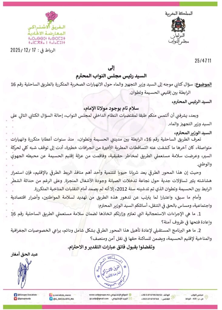 أمام ما عرفته الطريق الساحلية رقم 16 الرابطة بين إقليمي الحسيمة وتطوان من انهيارات متكررة، وما صاحبها من انجرافات خطيرة بعد التساقطات المطرية الأخيرة، وما ترتب عن ذلك من توقف شبه كلي لحركة السير وتعريض سلامة مستعملي الطريق لمخاطر حقيقية، تقدمت المتحدث عبد الحق أمغار بسؤال كتابي موجه إلى السيد وزير التجهيز والماء.